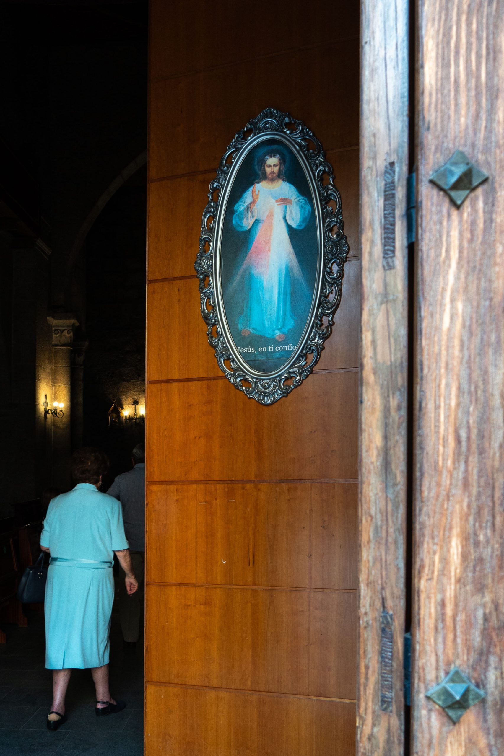 Casi siempre utilizo la cabeza pero un porcentaje pequeño de fotos responden a una reacción instintiva al ver situaciones únicas. Recuerdo especialmente cuando por el rabillo del ojo vi a una señora de azul que entraba en una iglesia en cuya puerta aparecía la figura de un Cristo ¡vestido de azul! Interrumpí, no muy educadamente, una conversación para tomar esta foto.