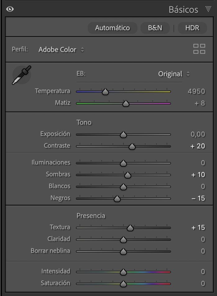 En los ajustes generales, reduzco ligeramente los negros, aumento sombras, el contraste y la textura: