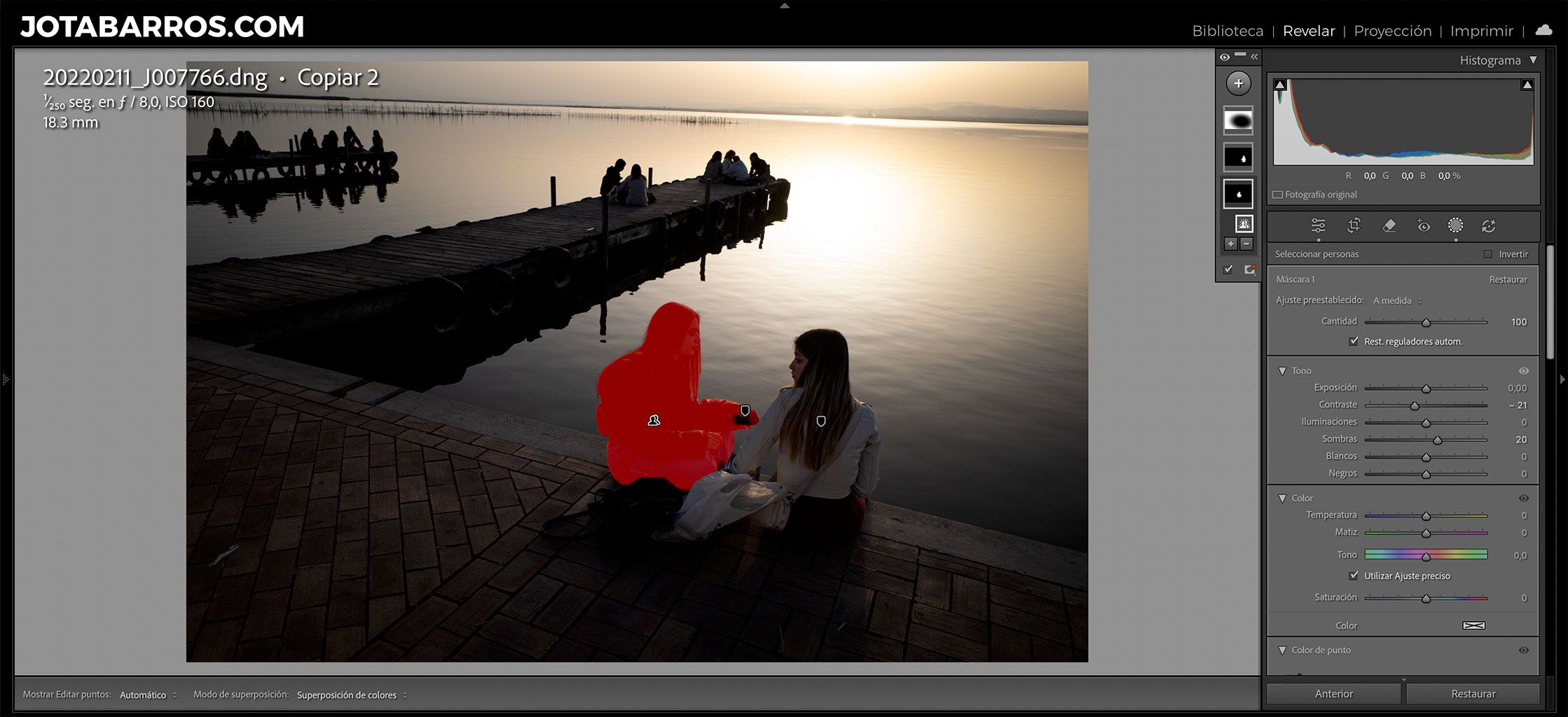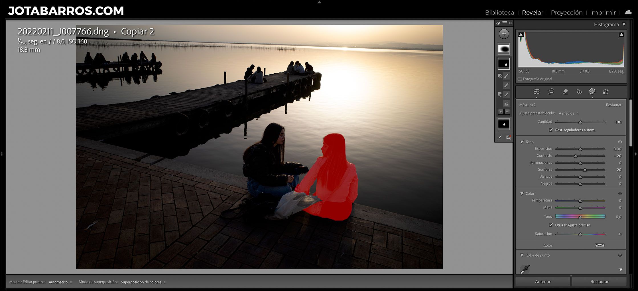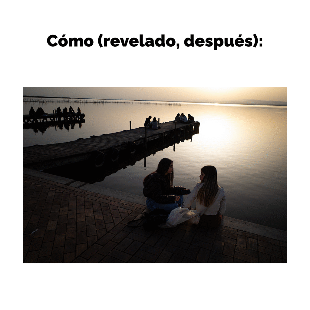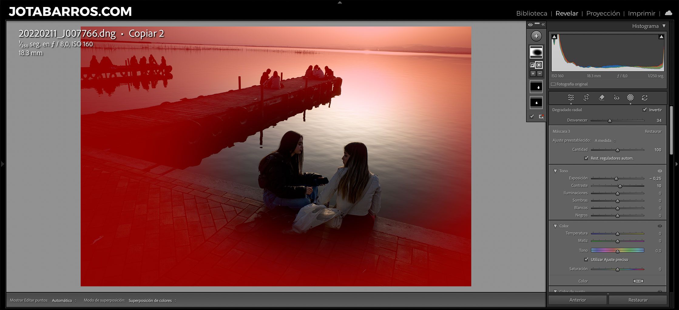 En las dos primeras aumento sombras y reduzco contraste para que, al aclararlas, las chicas ganen detalle y se separen un poco del muelle. En el degradado radial, invierto la máscara para que se aplique sobre los bordes, y los oscurezco ligeramente.