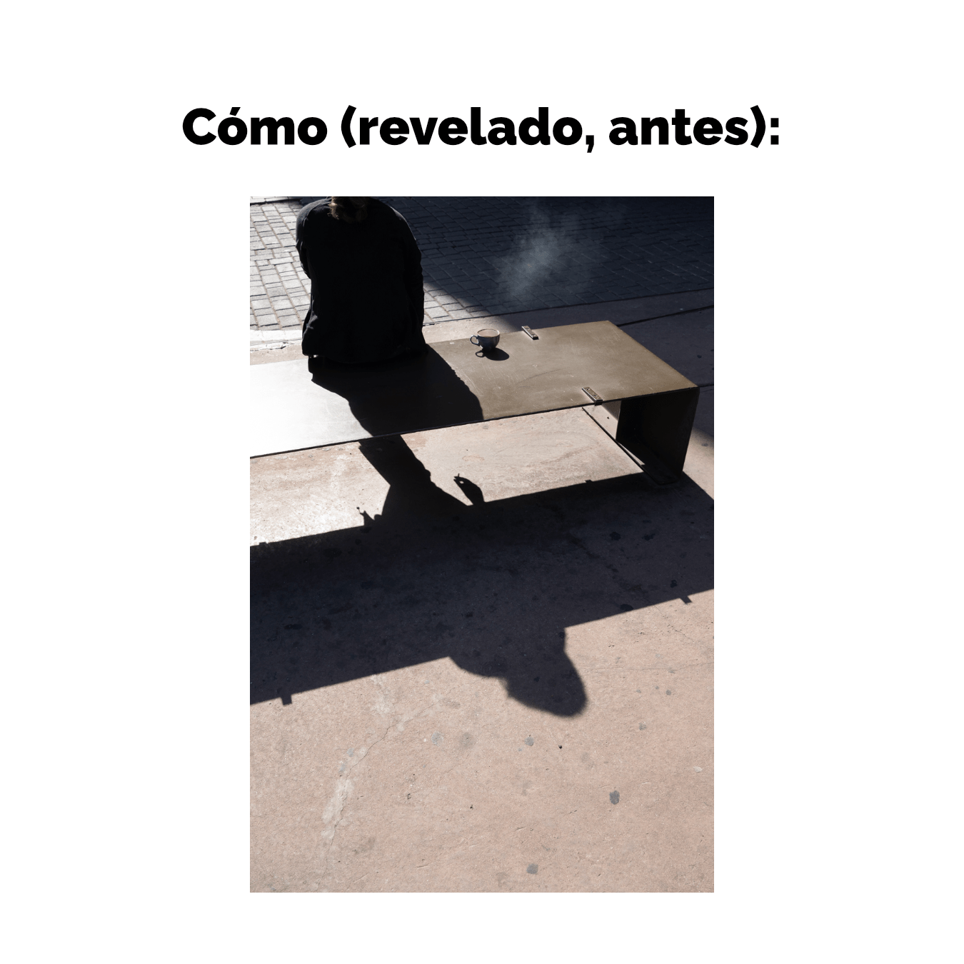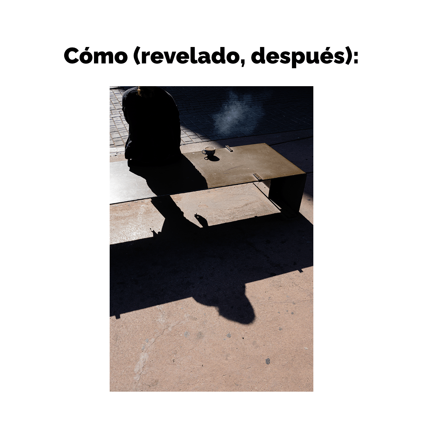 Entonces me fijo en cómo el gesto de la mano remite a la acción que no vemos. Decido dar un par de pasos adelante y encuadrar el vertical, para dar más protagonismo a la sombra del cuerpo y a la de la mano.